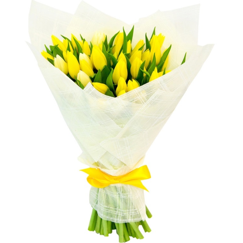 Букет состоит из 35 желтых тюльпанов, красивая упаковка, атласная лента.