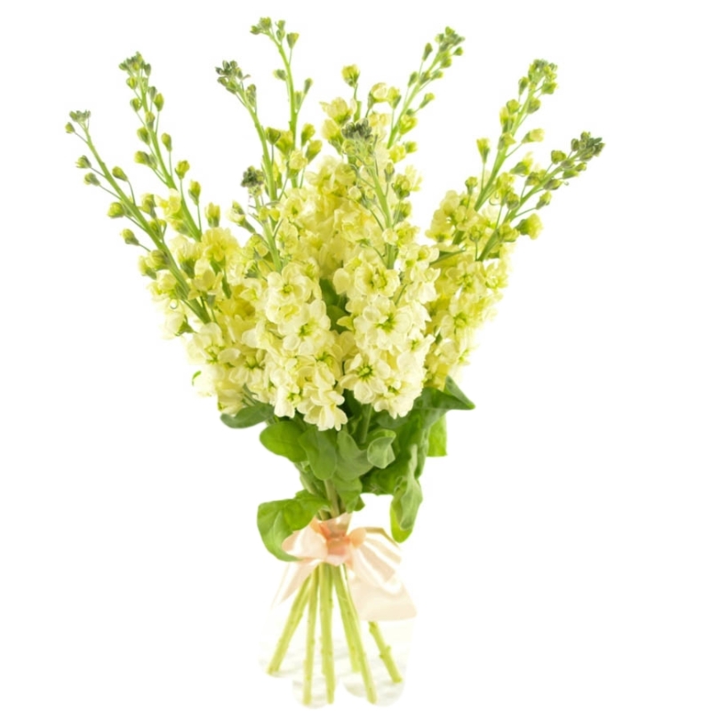 Букет состоит из 9 желтых маттиол, прозрачная упаковка, атласная лента.