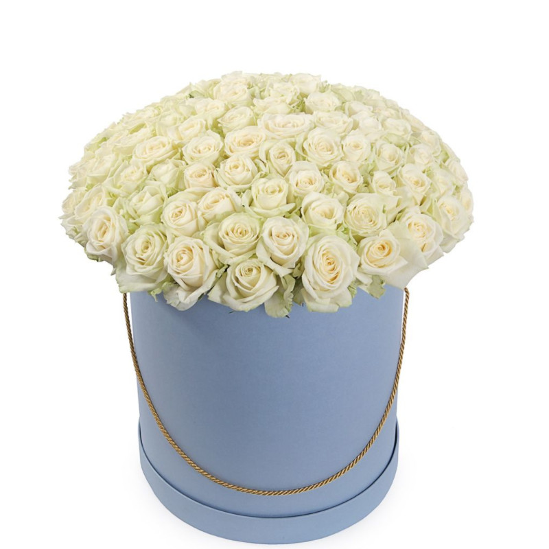 Букет состоит из 101 белая роза, голубая или синяя коробка.