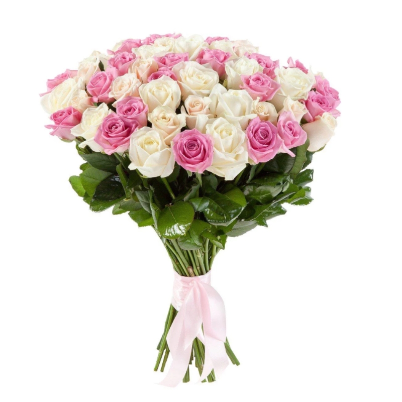 Букет состоит из 23 розовые розы, 22 белые розы, прозрачная упаковка, атласная лента.