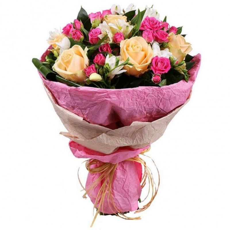 Букет состоит из 5 кремовых роз, 4 ветки кустовых роз, 2 альстромерии, 4 фрезии, зелень, крафт.