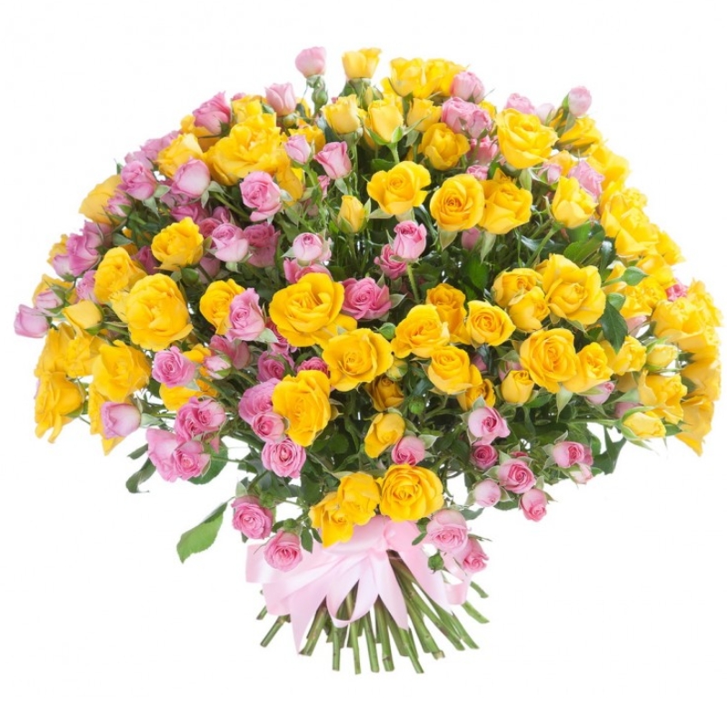 Букет состоит из 26 розовых кустовых роз, 25 желтых кустовых роз, прозрачная упаковка, атласная лента.